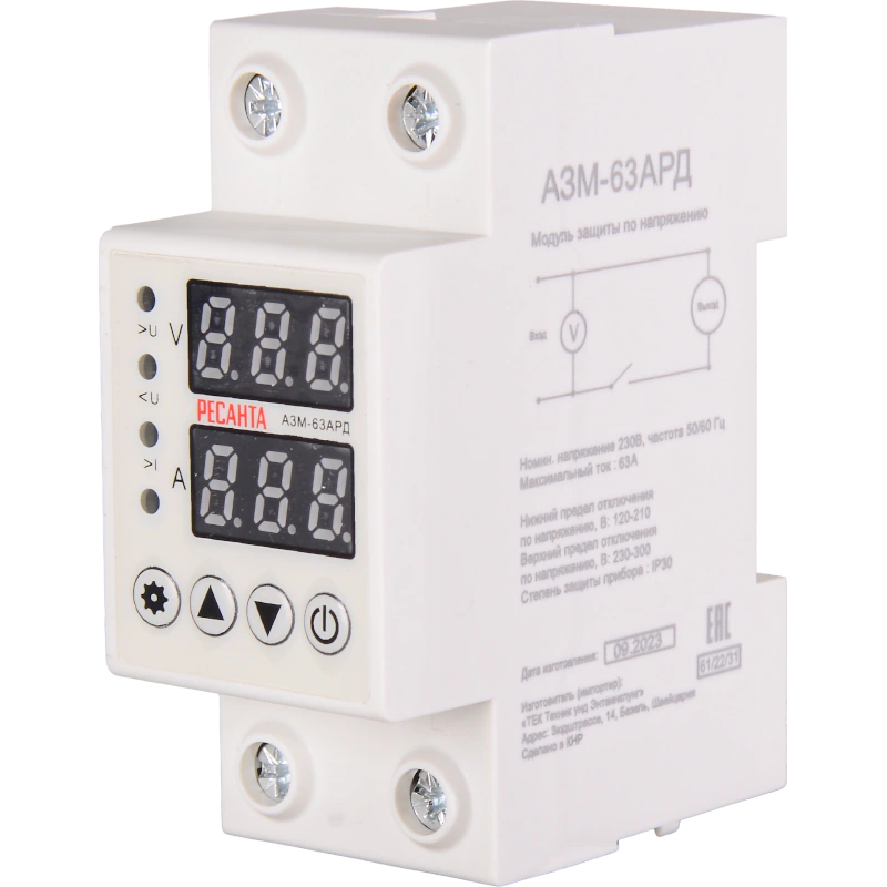 Блок защиты по напряжению Ресанта АЗМ-63АРД - автоматическое устройство защиты от повышенного/пониженного напряжения, в основном используемое для низковольтных распределительных линий для бытовых и аналогичных целей, автоматически обнаруживает сбой, связанный с повышением или понижением напряжения, и отключается, при восстановлении нормальных условий на линии, автоматически включается.