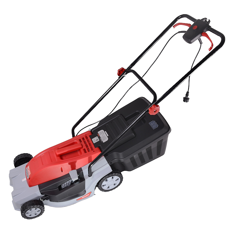 Электрическая газонокосилка оснащена рычагом для ступенчатой регулировки высоты кошения в диапазоне от 15 до 50 мм. Все четыре колеса опускаются или поднимаются одновременно. Устройство имеет простые элементы управления, расположенные на рукоятке. Во избежание случайного запуска косилка оснащена кнопкой блокировки. Электрический шнур надежно фиксируется на рукоятке и не мешает работе. Травосборник помогает поддерживать чистоту на обработанном газоне. Индикатор наполнения вовремя подскажет о необходимости опорожнения емкости от травы. Большая ширина скашивания позволяет быстрее обработать участок за меньшее число проходов.