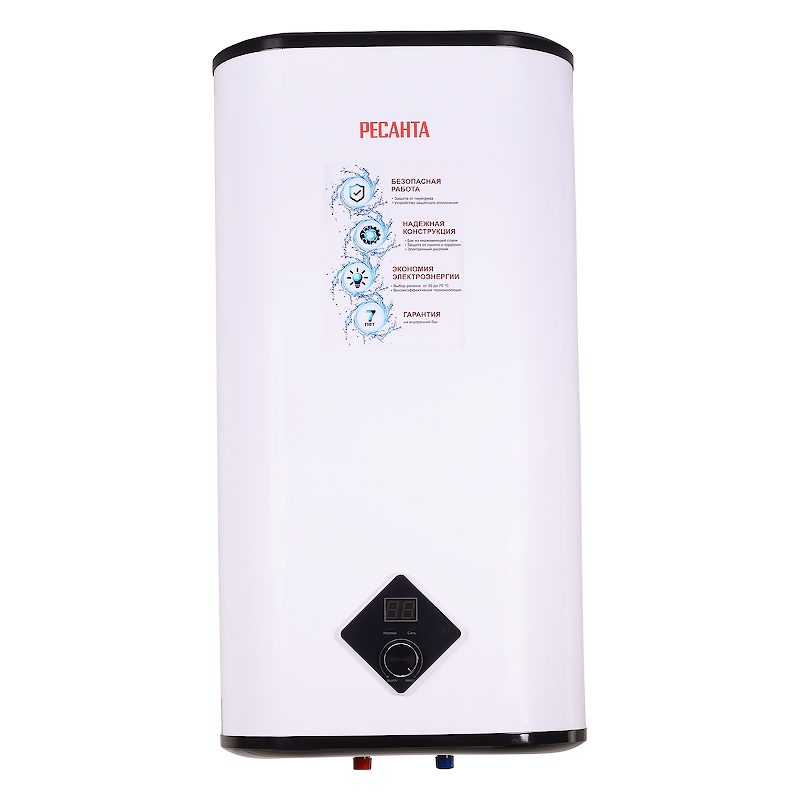 Водонагреватель накопительный Ресанта ВН-50А имеет вертикальный настенный тип крепления, плоский корпус и предназначен для нагрева холодной воды, поступающей из водопровода. Работает от электросети с напряжением 220 В. При помощи терморегулятора можно установить температуру нагрева в диапазоне от 30°С до 75°С, которая будет поддерживаться автоматически. В устройстве используется трубчатый нагревательный элемент из нержавеющей стали и магниевый анод. Объем накопительного бака равен 50 л. Нагреватель оснащен термометром и цифровым дисплеем, на котором отображается текущее значение температуры воды.